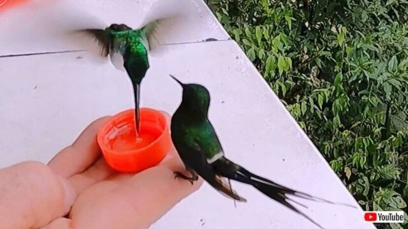 Tiny hummingbirds trustingly perch on human hand to sip nectar 手のひらに載せたボトルキャップには、美味しいシロップが入っている。早速やって来た一羽のハチドリが、美味しそうに吸い出したよ。