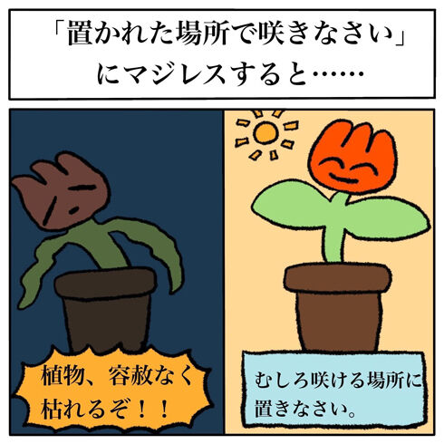 日陰に置かれた植物が枯れるのはその通りだけど、その枯れていく植物は「俺も日当たりのいい場所に居れば綺麗に咲くのに」って考えるか?ただ黙って、枯れるまでわずかな光で光合成するんだよ。